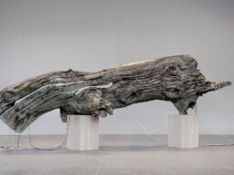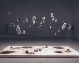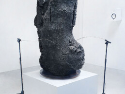Les pièces de Gil Delindro traduisent directement les étapes éphémères de la matière organique comme le sol, l’eau, le bois et les débris géologiques en œuvres spatiales et sonores. Ses installations, qui ont leur propre autonomie, utilisent activement les effets imprévisibles du temps, de la météo, de l’érosion et des conditions atmosphériques extérieures, en les opposant à des outils acoustiques fabriqués.